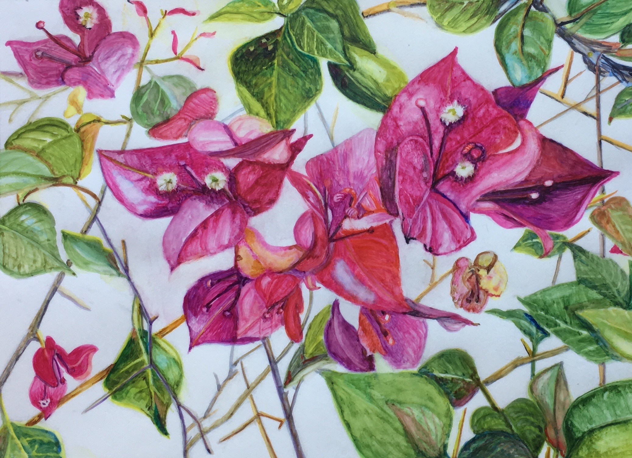 “Bougainvillea” botanical name: Bougainvillea spectabilis Family: Nyltaginaceae n10” X 7” image (vellum sheet 12” X 9”) watercolour on vellum     Cost: $300