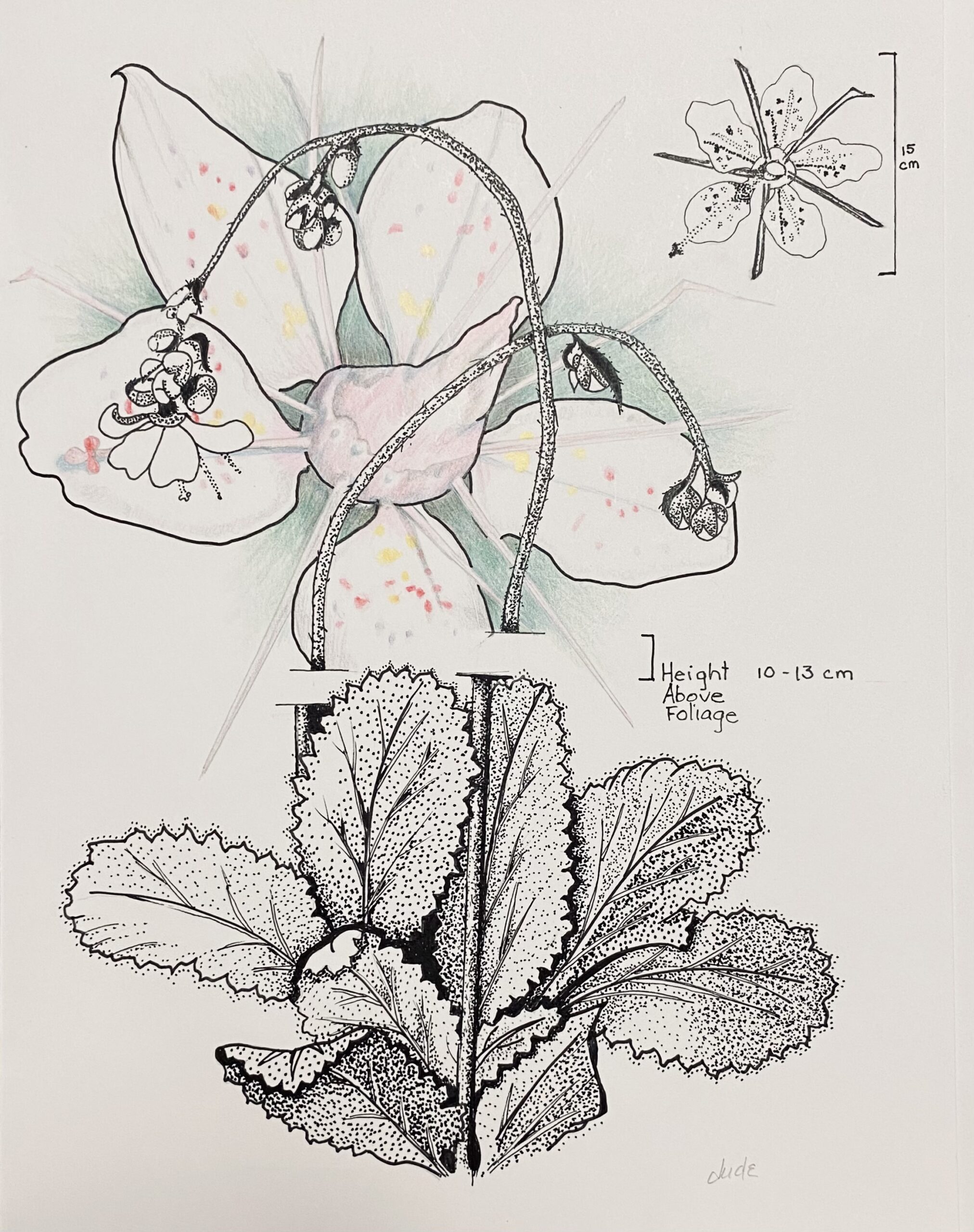 “True London Pride” botanical name: saxifrage umbrosa Family: Sarifiagaceae, 9” X 12 1/4” Micron pen and Colour pencil on Strathmore smooth Bristol paper
